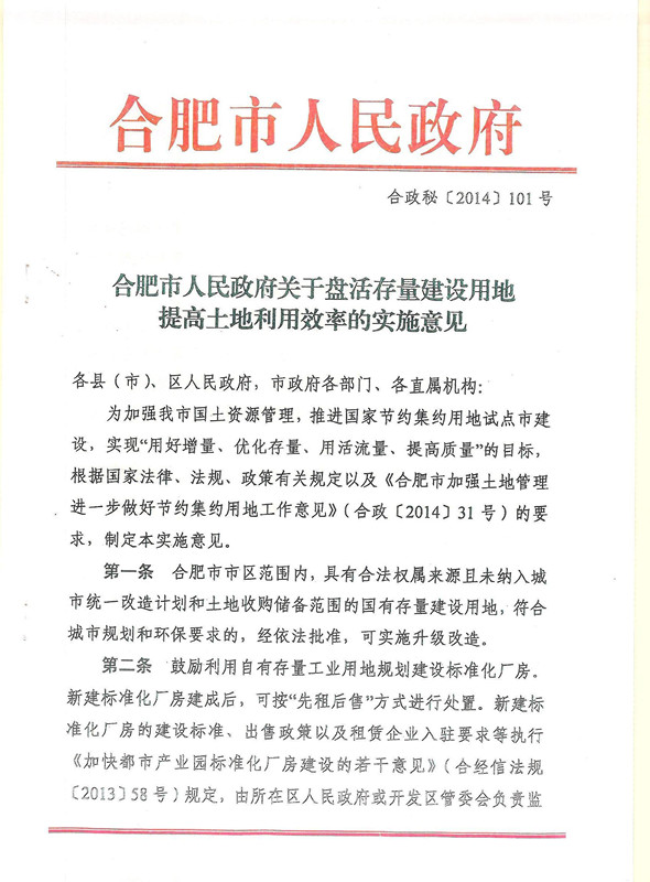 第二條 鼓勵利用自有存量工業(yè)用地規(guī)劃建設(shè)標(biāo)準(zhǔn)化廠房。新建標(biāo)準(zhǔn)化廠房建成后,可按“先租后售”方式進(jìn)行處置。新建標(biāo)準(zhǔn)化廠房的建設(shè)標(biāo)準(zhǔn)、出售政策以及租賃企業(yè)入駐要求等執(zhí)行《加快都市產(chǎn)業(yè)園標(biāo)準(zhǔn)化廠房建設(shè)的若干意見》(合經(jīng)信法規(guī)〔2013〕58號)規(guī)定,由所在區(qū)人民政府或開發(fā)區(qū)管委會負(fù)責(zé)監(jiān)督審核。符合出售條件的,經(jīng)所在區(qū)人民政府或開發(fā)區(qū)管委會出具書面審核文件后,國土部門可分幢、分層、分單元分?jǐn)傇O(shè)置工業(yè)用地使用權(quán),辦理轉(zhuǎn)讓手續(xù)。