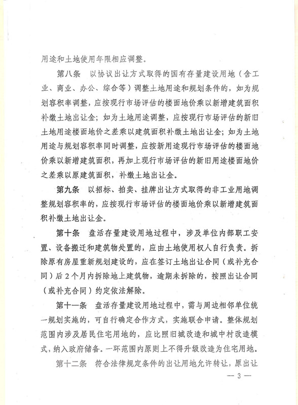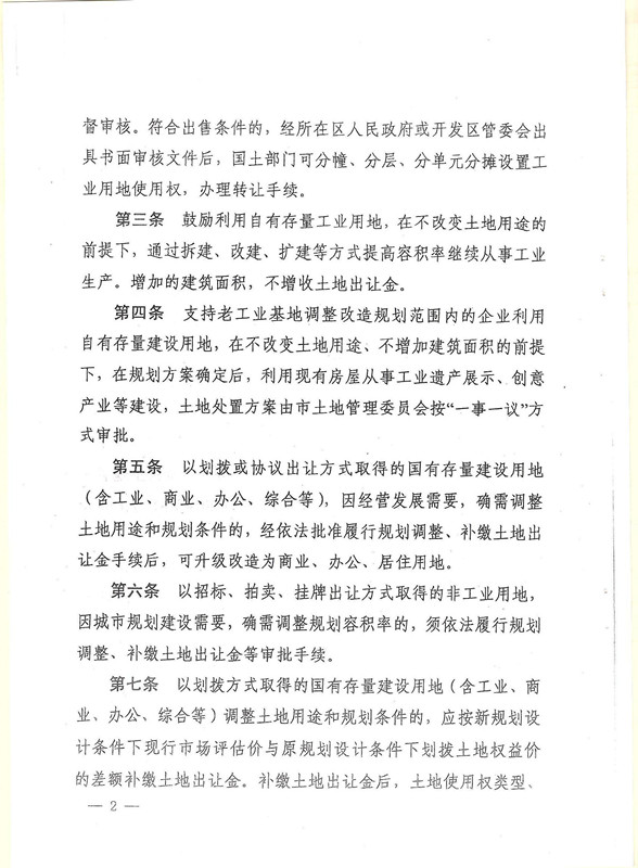第三條 鼓勵利用自有存量工業(yè)用地,在不改變土地用途的前提下,通過拆建、改建、擴(kuò)建等方式提高容積率繼續(xù)從事工業(yè)生產(chǎn)。增加的建筑面積,不增收土地出讓金。