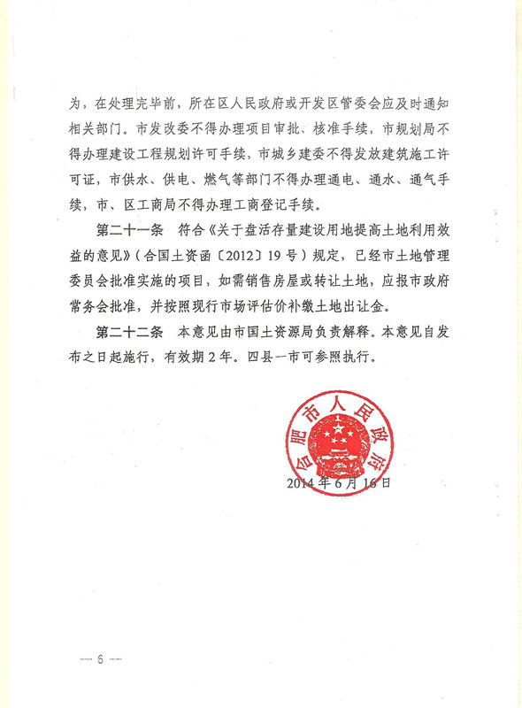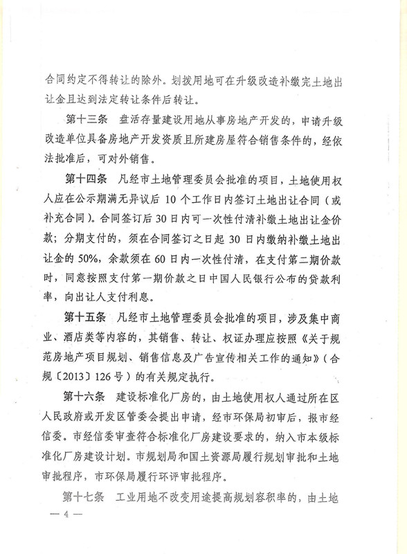 第二十一條 符合《關(guān)于盤活存量建設(shè)用地提高土地利用效益的意見》(合國土資函〔2012〕19號)規(guī)定,已經(jīng)市土地管理委員會批準(zhǔn)實(shí)施的項(xiàng)目,如需銷售房屋或轉(zhuǎn)讓土地,應(yīng)報市政府常務(wù)會批準(zhǔn),并按照現(xiàn)行市場評估價補(bǔ)繳土地出讓金。