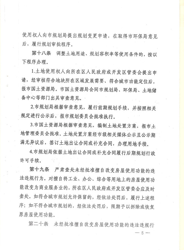 第十九條 嚴(yán)肅查處未經(jīng)批準(zhǔn)擅自改變房屋使用功能的違法違規(guī)行為。對擅自將工業(yè)、辦公、綜合等用地上的房屋使用功能改變?yōu)樯虡I(yè)服務(wù)業(yè)的,所在區(qū)人民政府或開發(fā)區(qū)管委會應(yīng)及時查處。如符合城市規(guī)劃允許保留的,經(jīng)依法處罰后,履行上述程序;如不符合城市規(guī)劃的,經(jīng)依法處罰后,限期予以拆除或恢復(fù)原房屋使用功能。