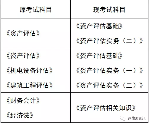 資產評估師職業資格考試科目將原來的《資產評估》、《財務會計》、《經濟法》、《機電設備評估》和《建筑工程評估》5個考試科目,調整為《資產評估基礎》、《資產評估相關知識》、《資產評估實務(一)》和《資產評估實務(二)》4個考試科目。