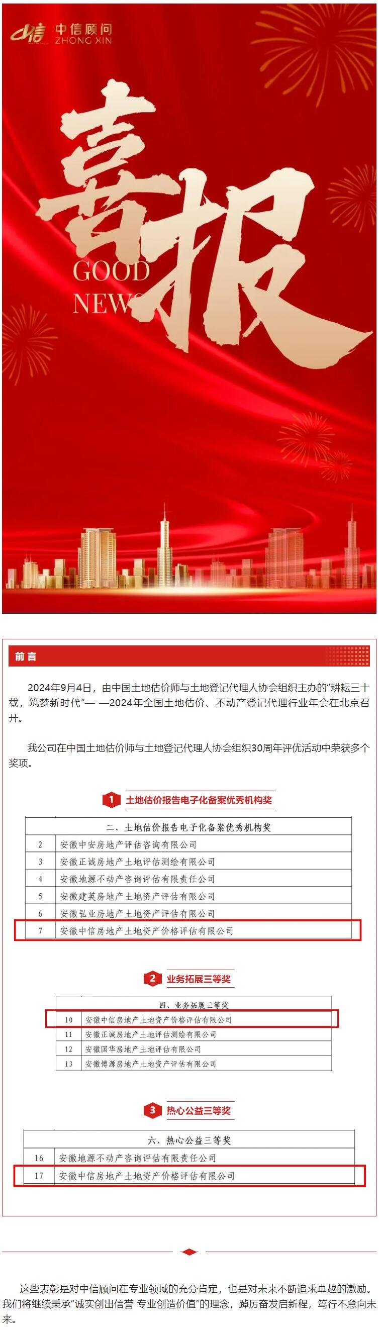 我公司在中估協(xié)30周年行業(yè)評優(yōu)活動中榮獲多個獎項
